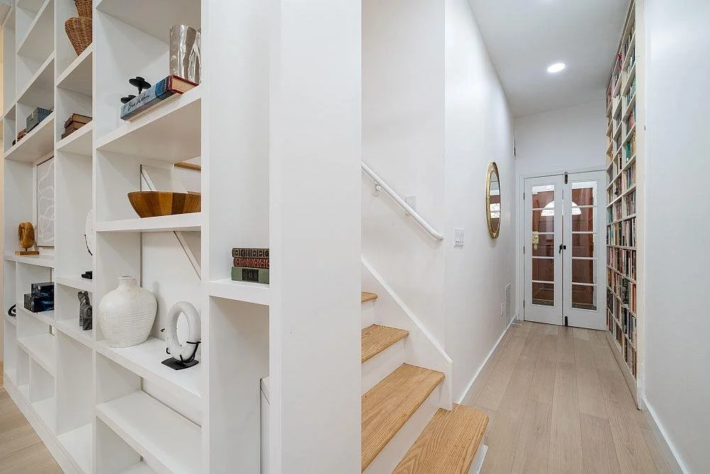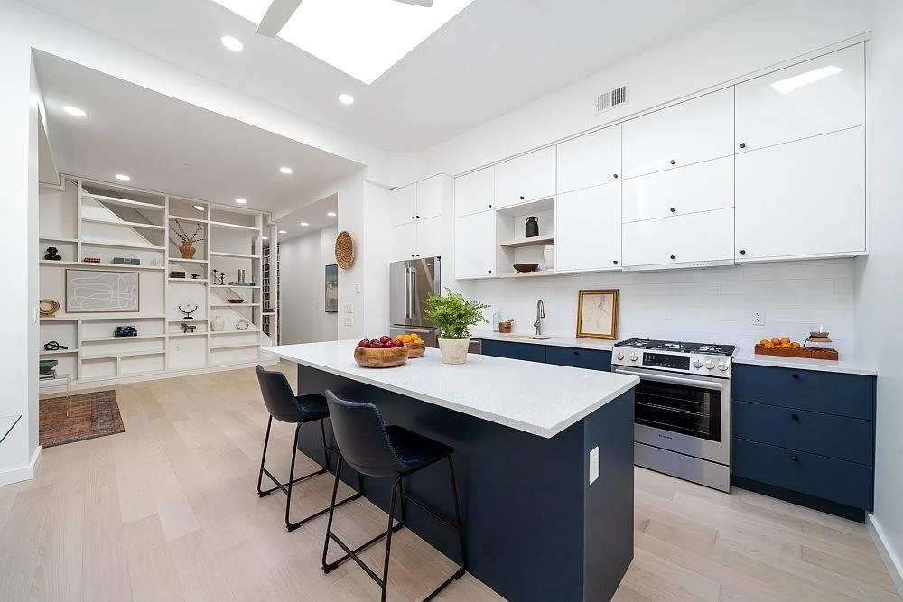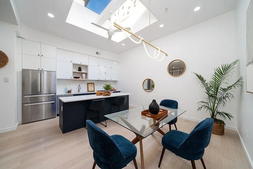 Just completed a renovation to a renovated firehouse turned townhouse in need of some refreshment. The design reworks the living, dining, and powder room on the ground floor, which has one source of natural light in the form of a large skylight above the kitchen area. The client has a large collection of art and books. The conceptual idea was to consolidate the art on one wall and the books along the stair wall, thus anchoring the open-concept space. The side walls include a new kitchen and bar that are materialistically designed (minimally) so that they do not draw attention away from the client’s collection. Capturing the limited natural lighting source was a key factor in the overall design of the space.
